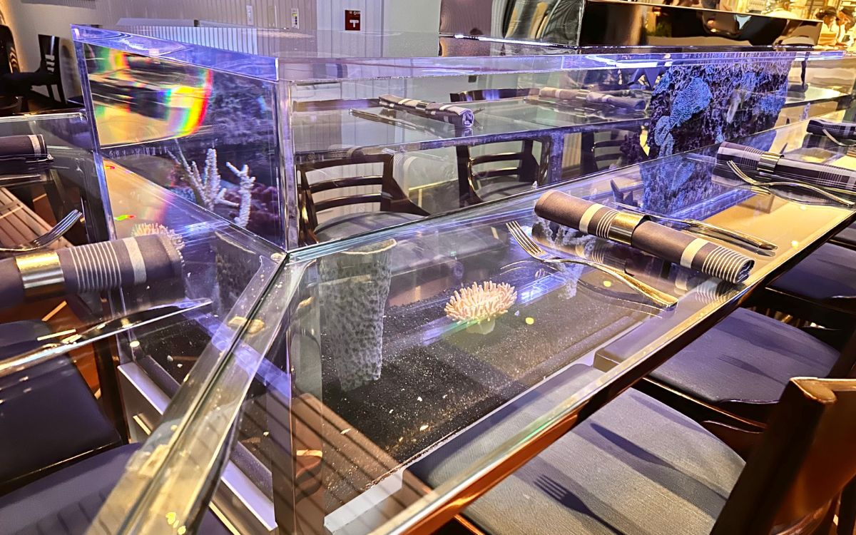 They don’t take reservations, and it’s fairly casual (don’t confuse that with inexpensive though ; ) but they’ve got great beachfront views and of course that super fun aquarium bar.